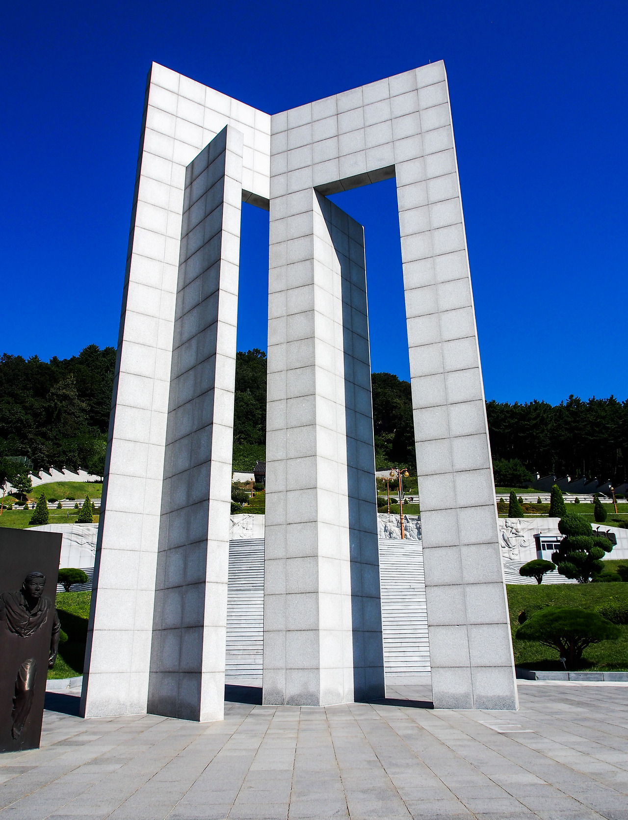 드넓고 완만한 비탈면에 조성된 묘지 중앙에 민주의 문이 우뚝 섰다. “열린 두 개의 문은… 그날의 뜨거운 정신인 정의와 민주를 나타내는 조형물”이다.