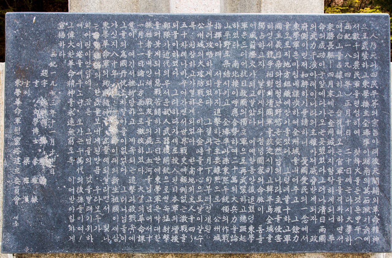 이곳은 패전의 현장이다. 갑오동학혁명 기념탑이 황토현에 건립된 지 10년 만에, 격전장이었던 이곳 우금치 기슭에 동학 혁명군 위령탑이 세워졌다.