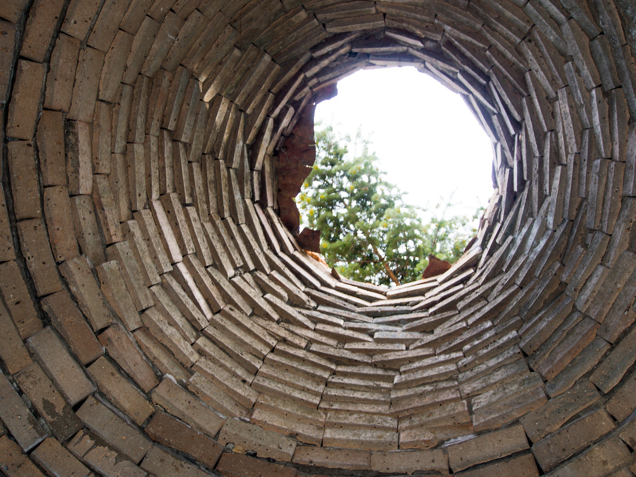 언덕 위에 자리한 탑 좌우로 작은 비문석과 부조벽도 들어섰다. 높이 7.5m 되는 탑신은 8각 수직 기둥이다. 탑신의 가장자리를 마치 단단하게 묶듯이 돌의 테두리를 둘렀다. 각지게 되니 더 힘차 보인다.