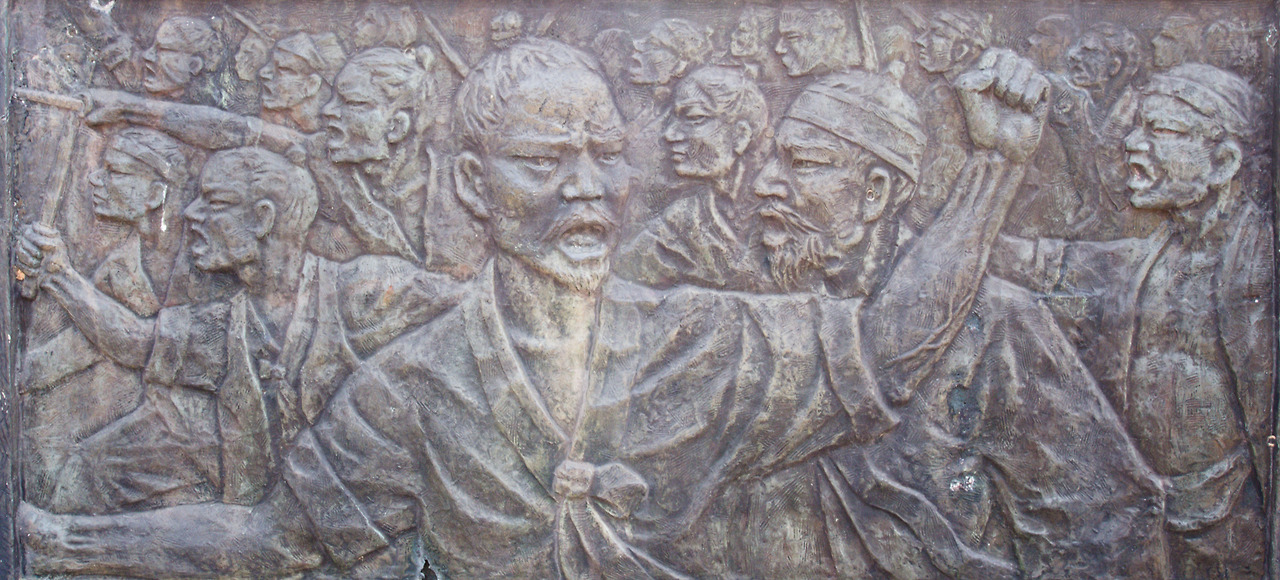 탑 우측 부조벽에는 전봉준과 농민혁명군을 도드라지게 새겼다. 과한 동작은 드러나지 않고 그저 성난 표정 중심으로 부각되었다. 어떤 사족도 없이 모두가 일체감을 보여준다.