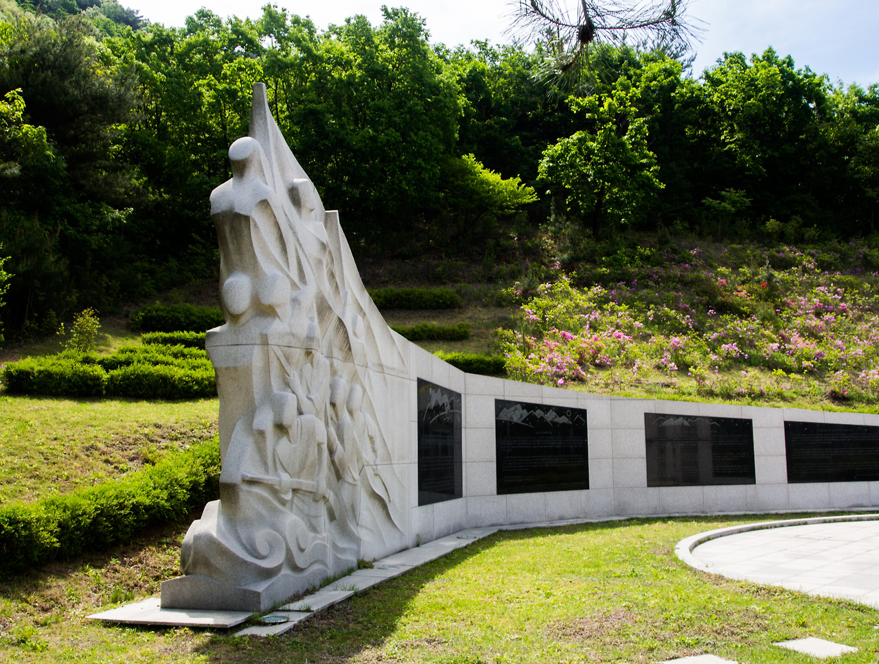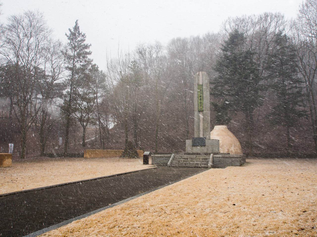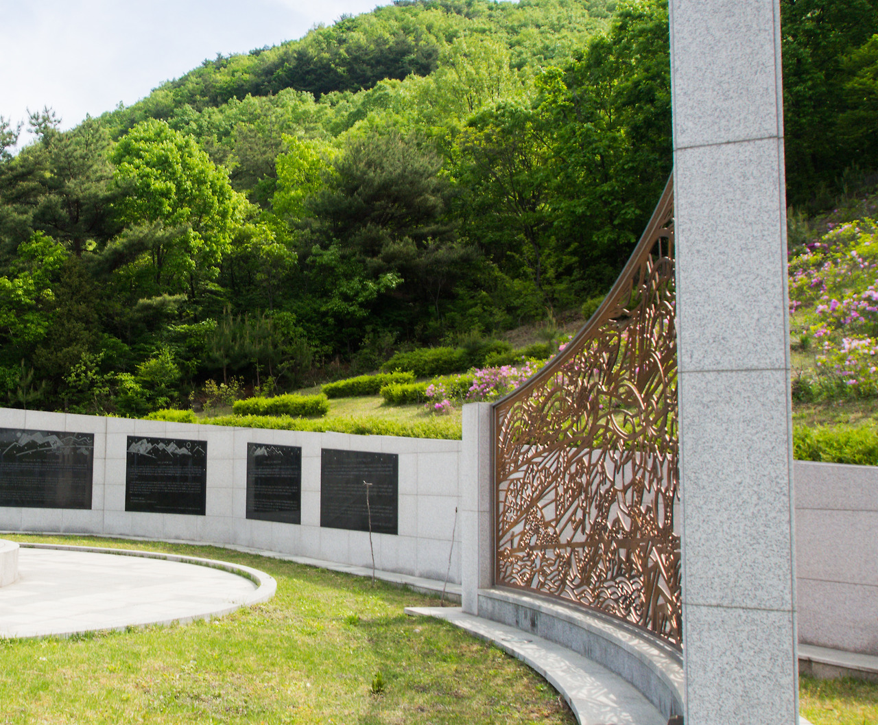 북향 산비탈 숲 속에 탑이 홀연히 서 있다. 여기 드넓은 기념공원에는 조형물과 관련 시설이 전시하듯 배치되어있다.