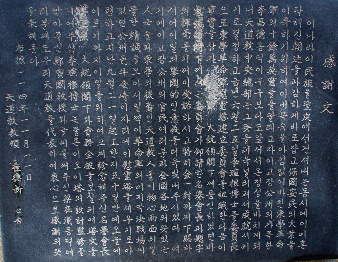 동학혁명 위령탑 탑 비문(전면), 봉화대 속에서 본 연돌, 탑 비문(후면) 감사문