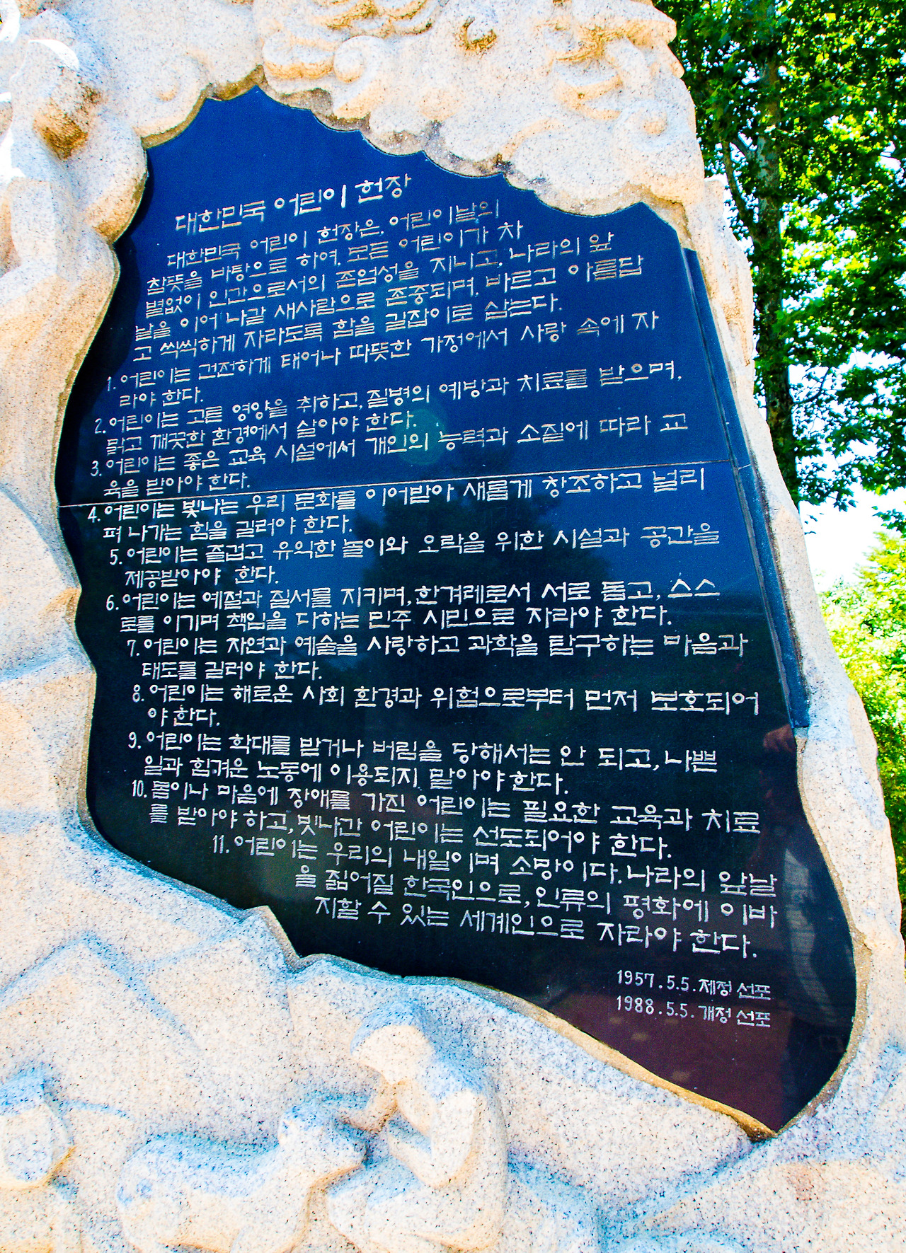 1. 대한민국 어린이헌장비: 1957년 5월 5일 건립, 서울 광진구 능동로 216 서울 어린이 대공원 내, 헌장 글: 윤석중, 차윤근, 김재은. 주정일, 김수남, 김용운, 장인협, 임광진, 서성옥, 박연수, 제작: □□□