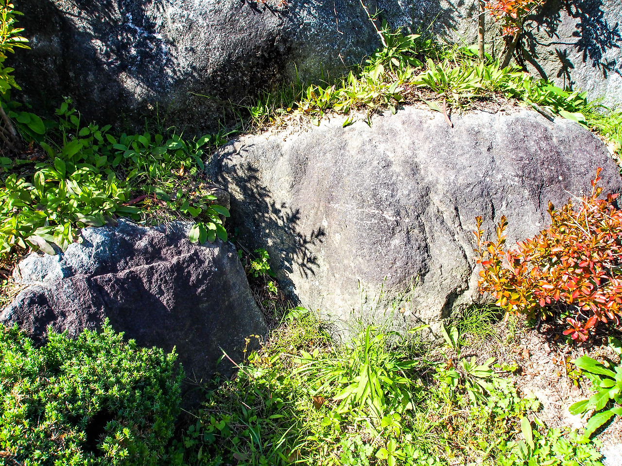 총탄 흔적이 남은 작은 바위가 정원석 같이 경사진 단을 메꾸고 있다.
