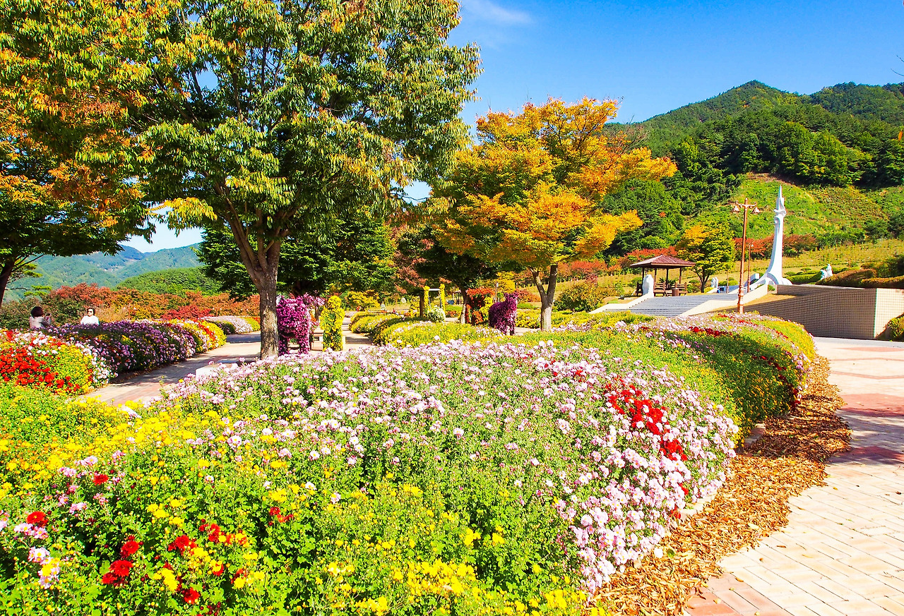 공원 넓은 곳에 꽃밭이 화사하다. 사람들이 즐기고, 여러 행사도 열린다.