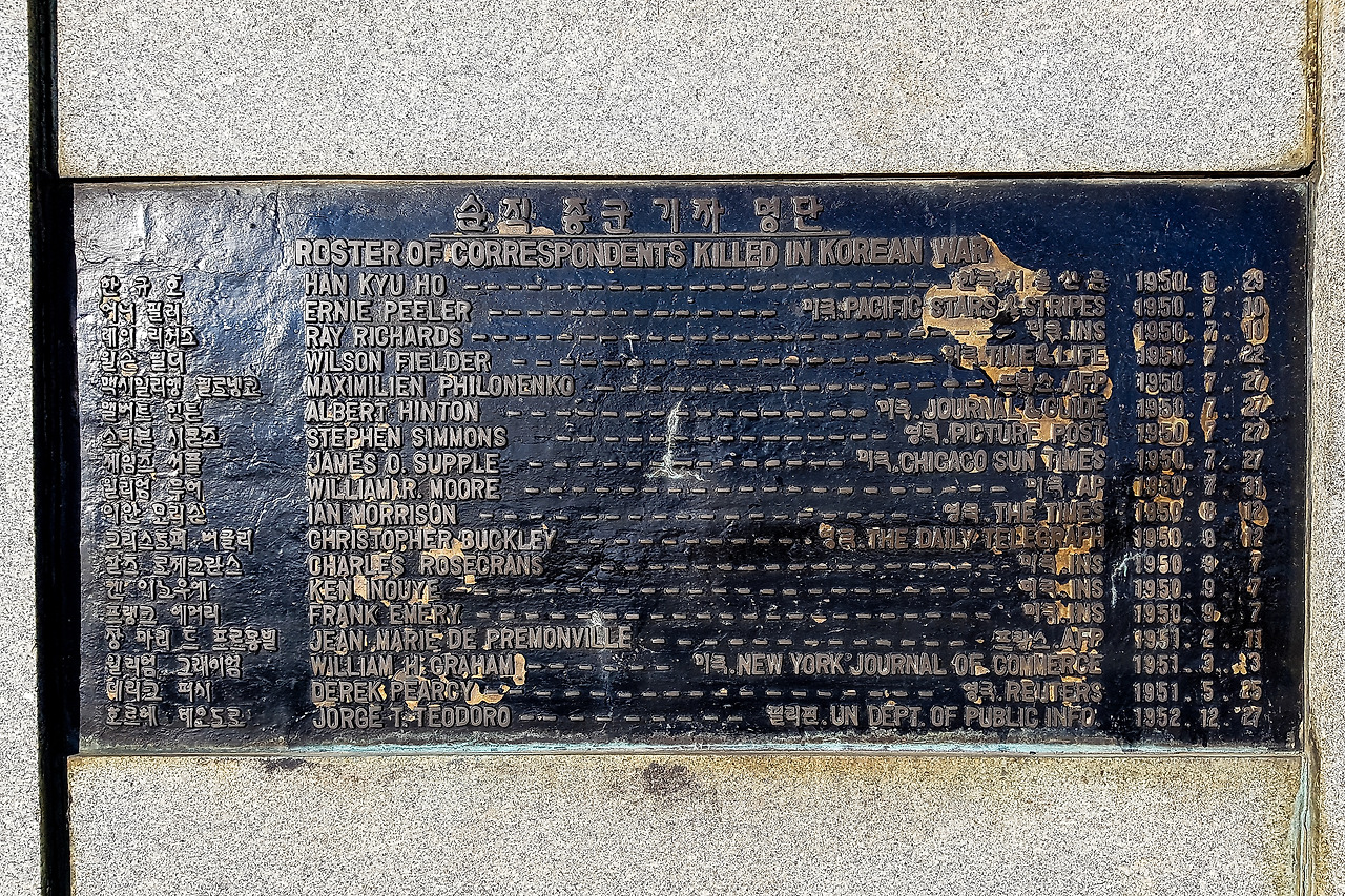 순직 종군기자 명단에는 열여덟 분의 이름을 모두 새겼는데, 미국 기자 열 분, 영국 기자 네 분, 프랑스 기자 두 분, 필리핀 기자 한 분, 그리고 서울신문의 한규호 님이다.