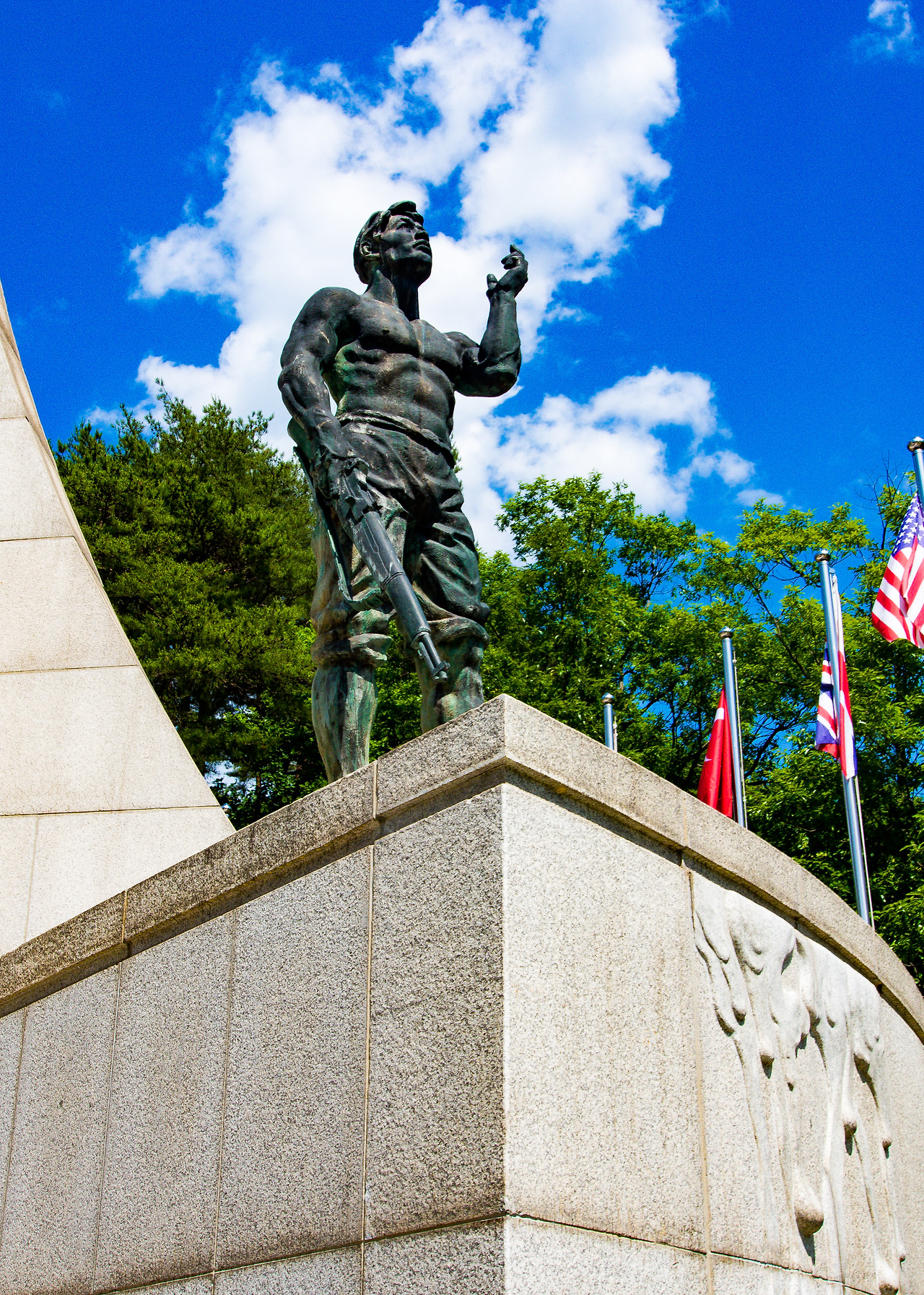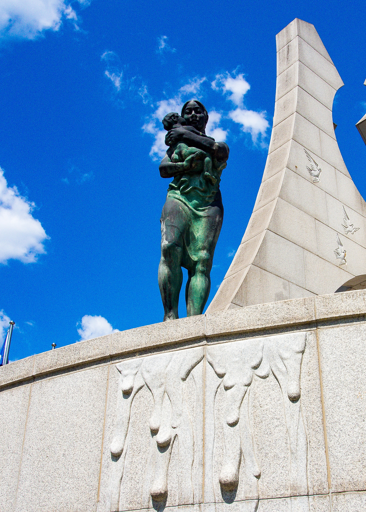 기단 좌우 끝에 남녀 두 동상이 나란히 섰다. 아기를 껴안은 여자는 아내인 듯, 소총을 내려 쥔 남편은 왼손을 들어 뭔가 아쉬운 모습이다. 한 가족, 그러나 떨어져 있을 뿐.