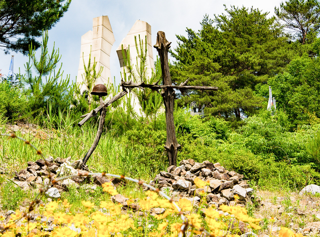 비목은 앞뒤로, 아래 위로 막혀있다. 이름 모를 야생화는 화사하게 피었는데….