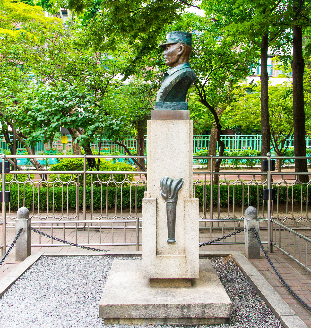 그런데 흉상은 쇠사슬 경계와 에워싼 스테인리스 스틸 철책 속에 가두어졌다. 경고문에 감시카메라까지. 오래전 붉은 페인트를 뒤집어쓴 사건이 있었기 때문이다.