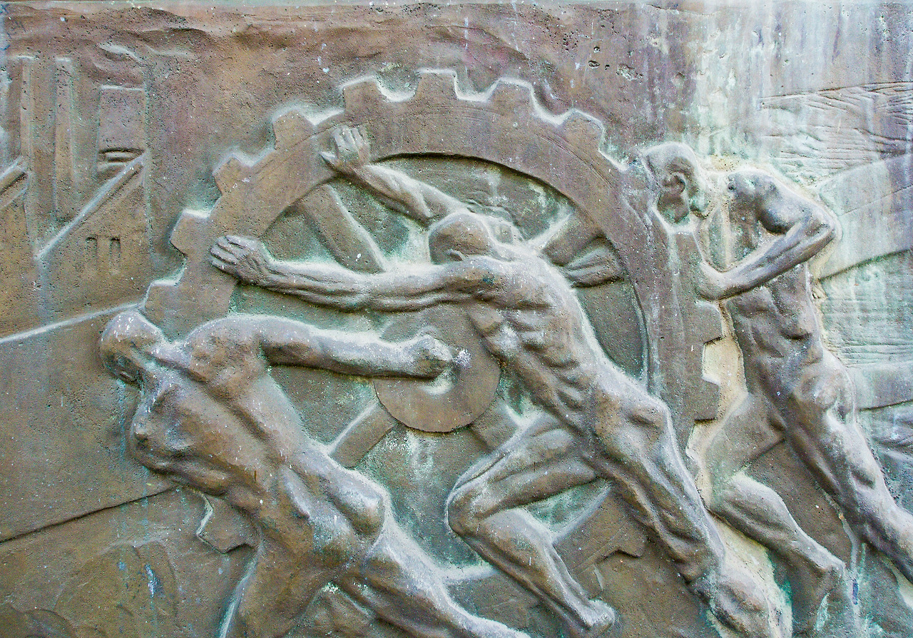 석재기단의 부조는 연기를 뿜는 굴뚝과 공장과 고속도로를 배경으로 사력을 다하고 있는 노동자의 모습을 보여준다. 그 시대가 추구했던 생산하고 건설하는 국가발전의 이미지이다.