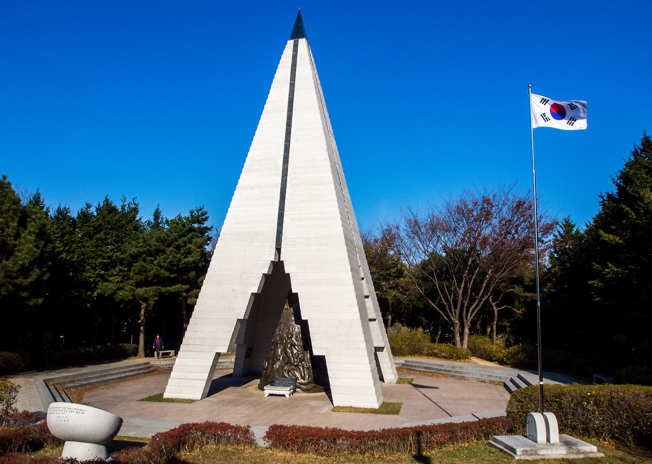 멀리 만세거리가 보이는 마안산의 동쪽 봉우리 사적공원 언덕에 자리 잡았다. 탑 높이는 21.6m. 바닥은 오히려 낮추었다. 그 속에 가파른 각도의 사각 피라미드 형태가 강렬하다. 네 옆면이 삼각 형태로 사방으로 열렸다. 그 속에 수많은 군상이 태극기를 중심으로 어우러져 큰 삼각뿔 형상을 이루었다.