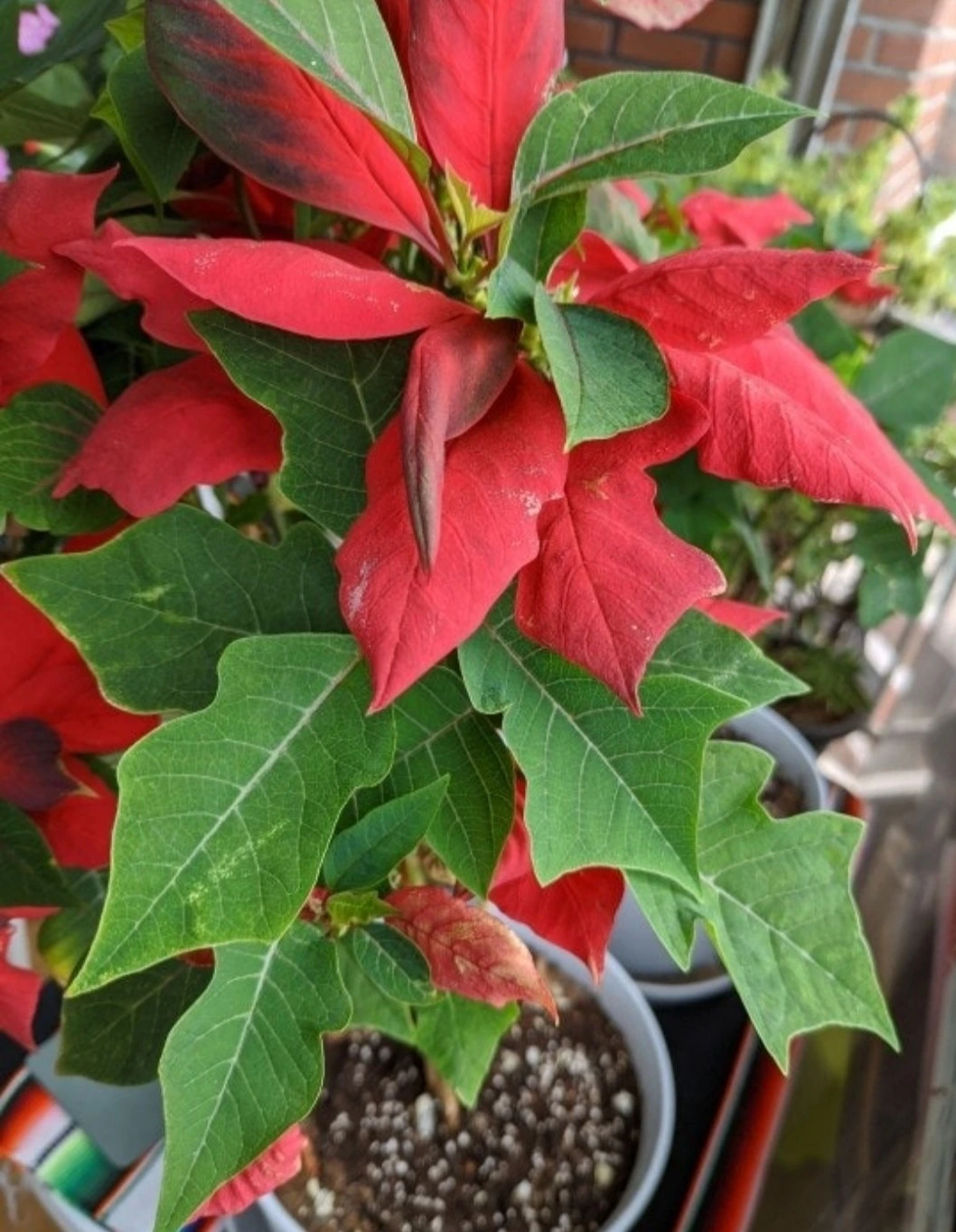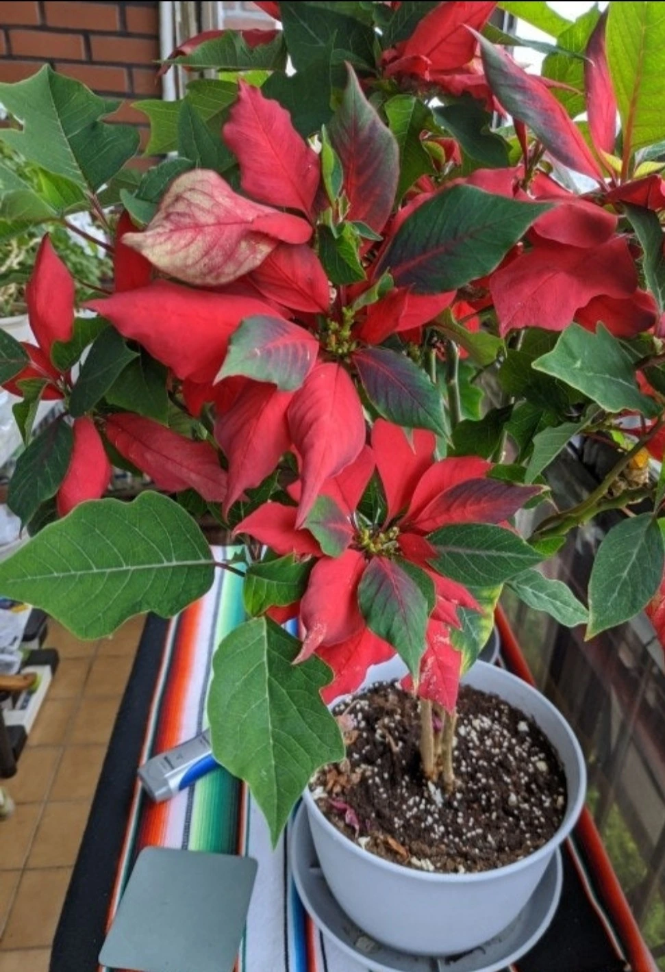얼어버린 땅 위에 화분에서 뽑힌 말라빠진 포인세티아 를 버리는 것을 목격했습니다.