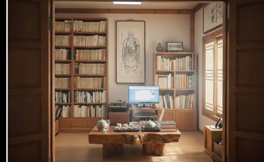 여성 신도 한분이 안내한 주지 스님의 집무실은 수행자의 공간이라기엔 묘하게 세속적인 편안함과 수행의 엄격함이 공존하는 곳이었다. 문을 열자 가장 먼저 반긴 것은 묵직한 침향(沈香) 냄새였다. 방 한쪽 벽면은 수백 권의 불경과 고서들로 가득 찼고, 반대쪽 벽에는 기운찬 필체의 달마도가 걸려 있었다 방 한가운데에는 오랜 세월의 흔적이 묻어나는 커다란 괴목(槐木) 찻상이 놓여 있었다. 그 위에는 정교한 다기 세트와 함께, 어울리지 않게도 최신형 PC 모니터와 두꺼운 법전들이 놓여 있어 주지 스님이 만만치 않은 지식과 정보력을 가진 인물임을 짐작게 했다.