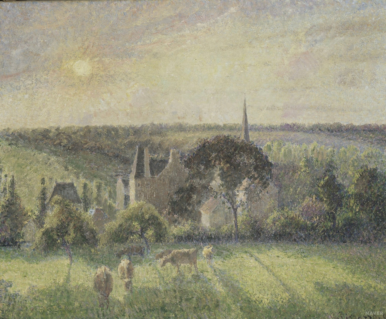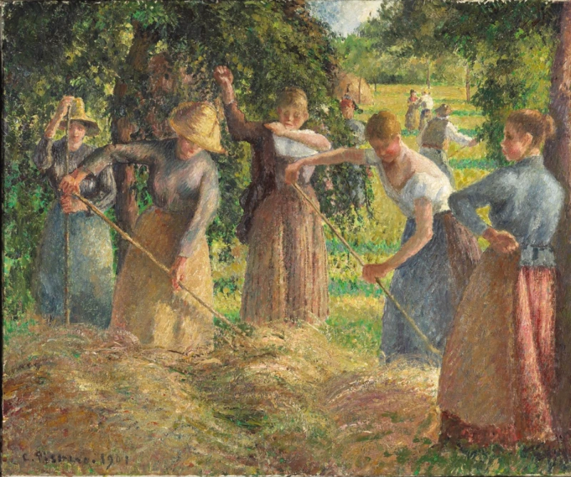 이런 그림은, 물론 그의 작품 초기 그림 선생이었던 바르비종파 ‘카미유 코로’ 의 영향이기도 하겠거니와 또한 그가 파리 북서부의 ‘퐁투아즈’나 말년의 ‘에라니’와 같은 작은 농촌마을에서 많은 시간을 보낸 탓일 터이다. 사실주의적 화풍으로 시작했던 그는 모네와 세잔과 교류하며 인상주의에 대한 감각을 나누며 첫 인상주의 전시회에 참여할만큼 빛에 따른 자연의 변화에 진심이었고, 피사로만의 독특한 주제 곧, 농장과 그곳에서 일하는 사람들을 주로 그려내곤 하였다.