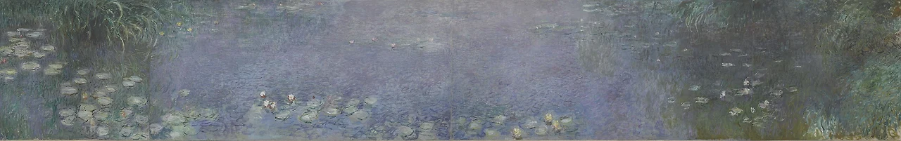 말년에 시력이 매우 나빠진 모네는 보다 커다란 화폭 위에 그나마 빛을 가장 잘 포착할 수 있는 한 낮의 풍경을 눈에 담아 기억속의 모습과 결합하며 작업하였다. 그럼에도 여전히 여러 색상의 물감을 두껍게 겹쳐 바르는 방식으로 대상의 물성을 과감하게 드러내고 있다. 때문에 가까이에서 보자면 대상을 알아볼 수 없을만큼 흐릿한 그림이지만 한발짝 떨어져서 보자면 빛을 받아들이고 굴절시키며 수면 아래 깊은곳까지 전달하는 윤슬과 그 위에 떠있는 수련 잎의 찰나가 적확하게 표현되고 있다.