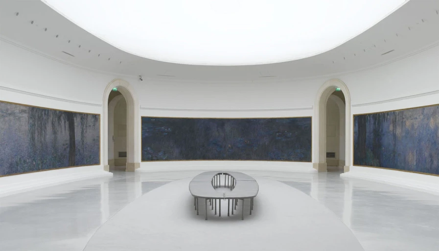 모네의 요청에 따라 그림을 가득 채우는 자연 채광을 받아들인 미술관은 100여미터의 벽을 따라 ‘수련:구름(Les Nymphéas : les Nuages)’ ‘수련 : 아침 (Les Nymphéas : Matin)’ ‘수련 : 일몰 (Les Nymphéas : Soleil couchant)’ ‘수련:초록 그림자(Les Nymphéas : Reflets verts)’ ‘수련:나무그림자(Les Nympheas : Reflets d’arbres)‘ ‘수련:아침의 버드나무들(Les Nymphéas : Le Matin aux Saules)’ ‘수련 : 버드나무가 드리워진 맑은 아침 (Les Nymphéas : Le Matin clair aux saules)’ ‘수련 : 버드나무 두 그루 (Les Nymphéas : Les Deux saules)’ 등 그림을 전시하고 있다.