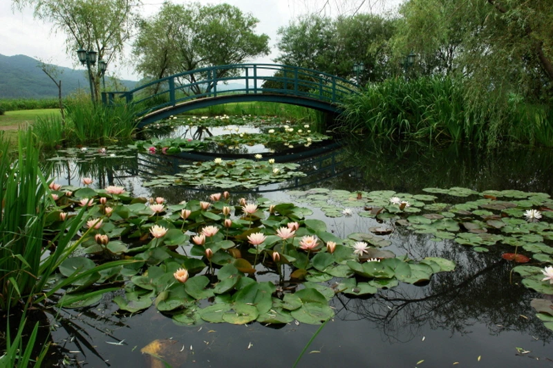 세미원 하이라이트의 하나는 사랑의 연못이다. 수련이 떠 있는 연못, 일본식 아치형 다리 그리고 연못가의 버드나무 등, 모네의 그림에서 본 지베르니 정원을 그대로 옮겨놓은듯 하다. 한편으로는 배경의 낮은 산자락과 우리 눈에 친숙한 식물들로 구성되어 우리네 오래된 정서와도 자연스럽게 맞닿아 있는 점이 흥미롭다. 특히 해질녘, 노을이 연못 위로 내려앉을 때 이곳을 찾는다면 더욱 특별한 순간을 만날 수 있다. 석양이 수면에 반사되며 번지는 붉은 빛이 수련 사이로 퍼지는 풍경은, 그 순간을 화폭으로 옮기지 못하는 나의 짧은 손이 부끄러울만큼 아름답다.