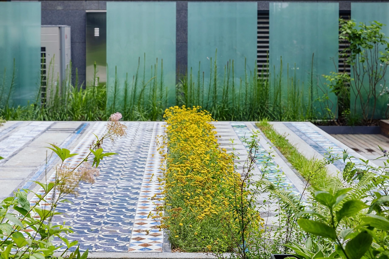 타일이 돋보이는 정원의 대표작으로는 서울시립대학교 김아연 교수의 연작 ‘carpet’을 소개하고자 한다. 아라비안 나이트의 나는 양탄자에서 모티브를 따와, 사람들이 모이고 이야기하는 우리네 전통 평상의 풍경을 재현한 그의 작품은 작은 공간에이라도 치밀하게 의도된 소재가 어떻게 새로운 경관의 이미지를 만들어낼 수 있는가에 대한 좋은 사례가 되고 있다.