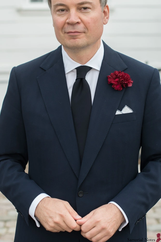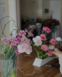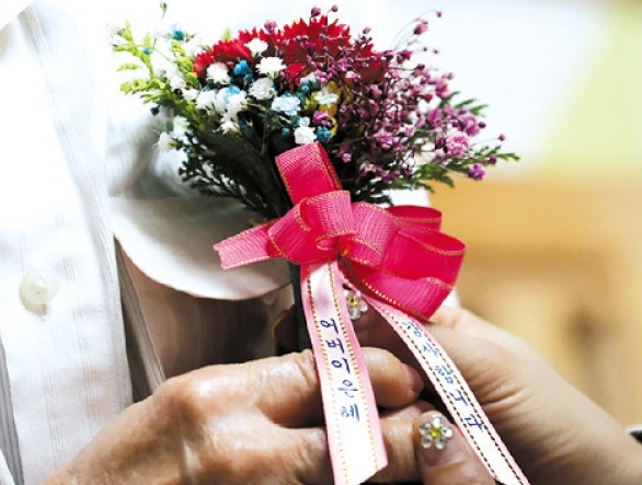 < 양복 가슴주머니의 카네이션 장식(왼쪽). 이케바나 화병의 카네이션(오른쪽) >