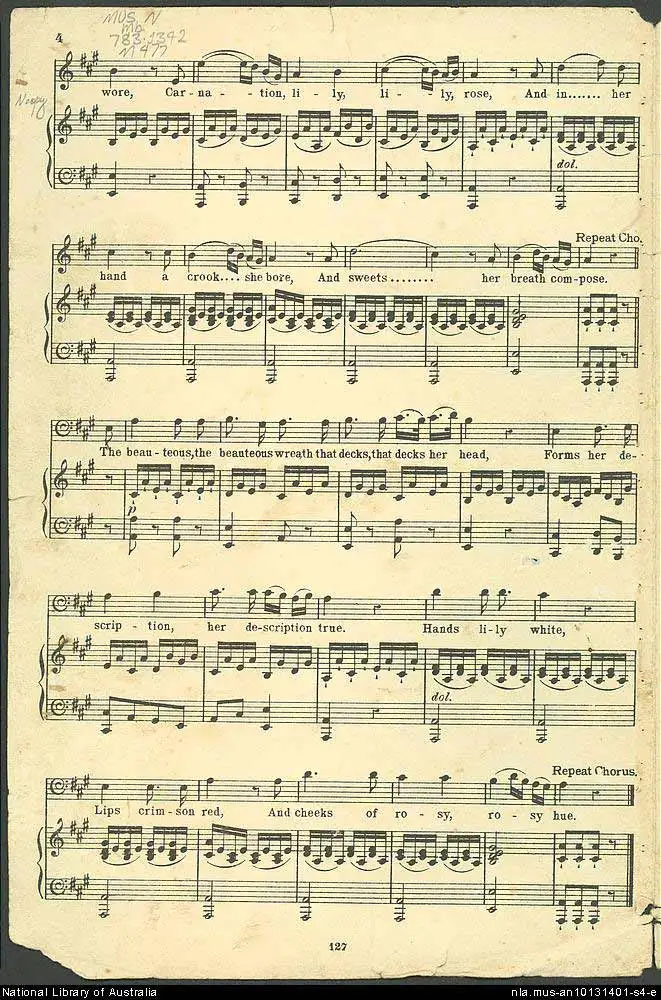 (A wreath around her head, around her head she wore, Carnation, lily, lily, rose)’
