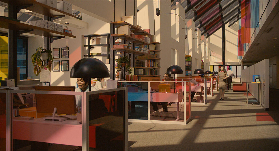 미래의 도시는 깨끗하고 정돈되어 있다. 복잡함도 없고, 군중도 없다. 심지어 사람들조차 모두 각자의 디바이스와 이어져 있을 뿐 서로 마주보지 않는다. 테오도르는 군중 속에서 걷지만, 그의 시선은 언제나 낮고, 좁고, 자신에게 닫혀 있다. 고층 건물과 거대한 유리창은, 연결을 약속하는 기술의 상징이면서도 그 자체로 고립을 강화하는 장치다. 공간은 텅 비어 있지만, 그 안에 '감정'은 꽉 차 있다. '침묵'은 감정을 증폭시키는 공명판이 된다.