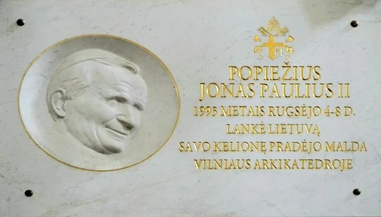 근래의 교황 가운데 재위 기간이 가장 길었던 교황은 폴란드 출신의 요한 바오로 2세(Pope John Paul II, 1920~2005. 재위: 1978~2005)인데, 이렇게 말하면 불경스러운 것이 될지 모르겠다만 여행을 다니시는 것을 적어도 싫어하지는 않으셨던 분이라는 것만은 확실하다. 재위기간 중 무려 104회나 여행길에 오르며, 129개국을 순방하신 기록을 남긴 것을 보면 말이다. 물론 우리나라도 다녀 가셨다. 그러다보니 세계의 수많은 성당에서 당신의 족적을 발견할 수 있는데, 유럽여행만 25년을 한 나는 실로 수없이 많은 성당에서 당신을 만날 수 있었다. 이런 점을 생각해 보면 리투아니아와 바로 접해있는 폴란드 출신인 당신께서 빌뉴스 대성당 또한 다녀가셨을 것이란 것을 얼마던지 추단할 수 있는데... 역시 다녀 가셨다. 그리고 대성당 측은 이 사실을 벽면에 이렇게 남겨 놓고 있다.