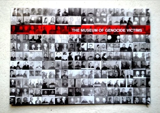다른 하나는 이 곳에서 죽음을 맞은 사람들의 얼굴들 위로 붉은색 바탕에 흰색으로 쓰여진 '집단학살 박물관'이란 글씨가 선명한 사진이다.