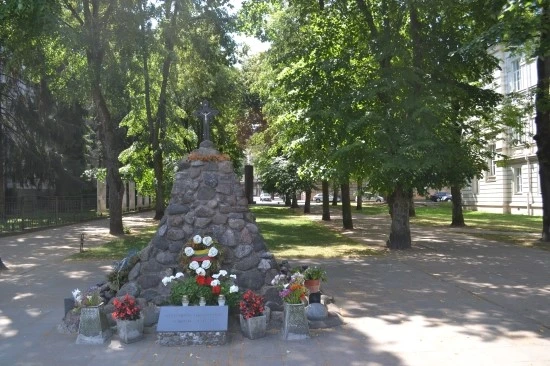 위의 건물을 따라 조금만 더 걸으면 왼쪽으로 빌딩 숲 사이에 나무가 우거진 길을 만나게 되는데, 그 초입에 이 곳에서 삶을 마감한 희생자들을 기리는 기념비가 보인다. 그리고 기념비 왼쪽에 '리투아니아 집단학살 박물관'의 출입구가 있다.