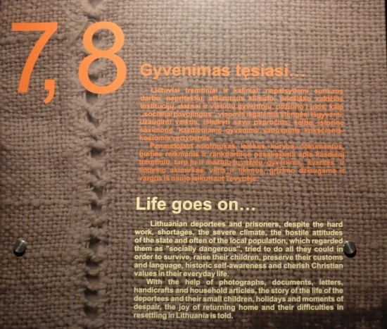 강제이주를 당한 리투아니아인들의 삶은 그야말로 처절했다고 하는데, 각종 필름과 사진 및 기록들이 그를 웅변으로 잘 보여주고 있다. 죽음의 땅 시베리아에서 학살과 불평등으로 고통을 겪기는 하였지만, 그 곳에서도 리투아니아인으로서의 삶은 계속되었다.