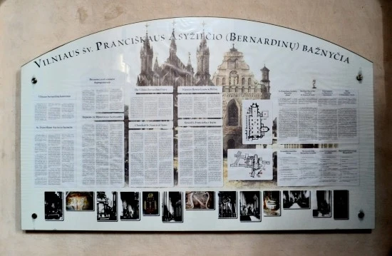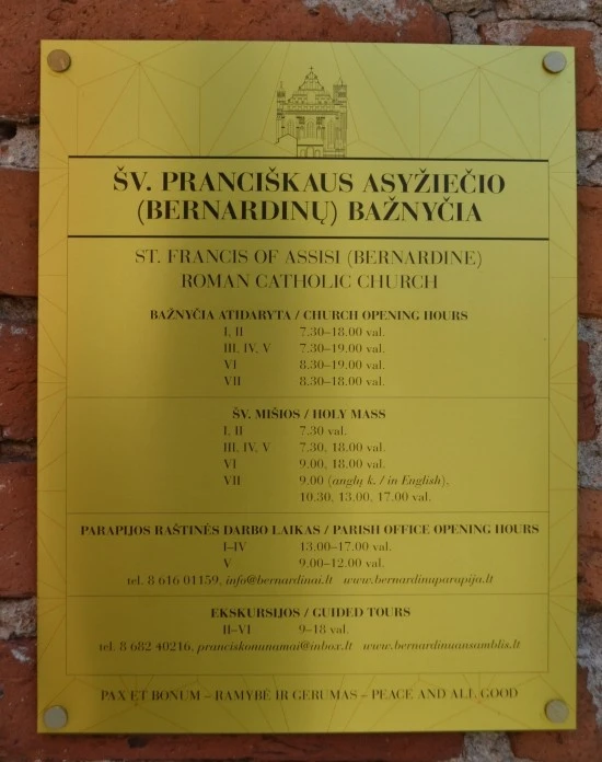많은 리투아니아 여행기들은 지금부터 내가 이야기 하는 성당을 '프란치스쿠스 베르나르디나스 성당'이란 이름으로 소개하고 있는데, 과연 이 성당을 '프란치스쿠스 베르나르디나스 성당'이라고 부르는 것이 맞는지는 확신이 안선다. 왜냐하면 이 성당의 외벽에 붙어 있는 안내판을 보면 아시시의 성자 프란치스쿠스 뒤에 ( )가 보이고, 그 안에 (베르나르디나스)라고 써 있기 때문이다. 문제는 베르나르디나스가 프란치스쿠스의 다른 이름인지, 아니면 그가 속해 있던 수도회의 이름인지를 확인할 바가 없다는 것인데, 하여 일단 다른 분들의 예에 따라 이 성당을 '프란치스쿠스 베르나르디나스 성당'이라고 부르기로 하겠다. 아, 프란치스쿠스 성자는 우리가 "성 프란체스코의 기도문"을 통해 잘 알고 있는 프란체스코(Francesco, 1182~1226) 성자를 말하는데, 그래서 그런지 이 성당은 15세기에 이탈리아 수도사들에 의해 건축되었다고 한다.