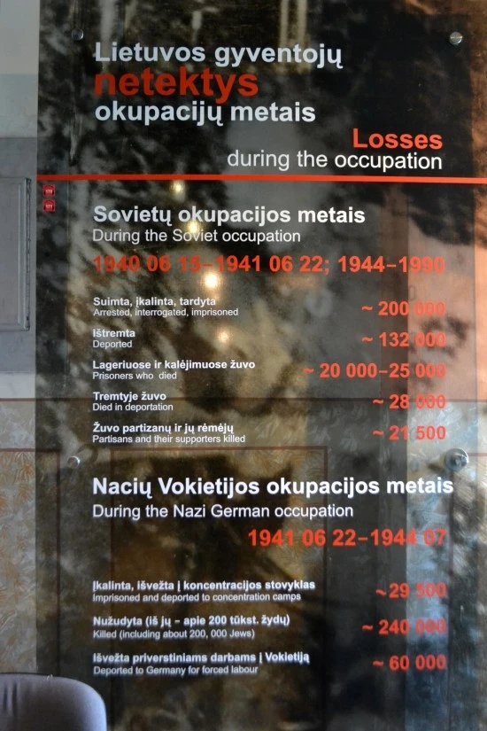 이어서 나치 독일과 소련(러시아)의 지배하에 얼마나 많은 리투아니아 사람들이 투옥되고 처형되었으며, 또한 강제이주를 당하여 노역에 시달렸는지를 보여주는 자료가 보인다.