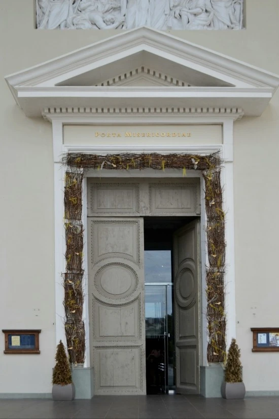 우선 문 위쪽과 성벽을 따라 나 있는 구멍들은 성의 본래의 기능인 군사적 목적을 위해 만들어진 것으로, 적들을 향해 몸을 숨기고 사격을 하기 위한 것이다. 그리고 중앙에 있는 벽화의 주인공은 의심의 여지 없이 물론 예수님이시다. 한편 문의 맨 윗부분에는 대통령궁의 문에서 보았던 것과 같은 맥락의 문양이 새겨져 있다. 이 부분은 르네상스양식의 '다락방'에 해당하는데, 문안으로 들어가 뒤로 돌아서서 문쪽을 바라보면 다락방의 모습을 알아 볼 수 있다.
