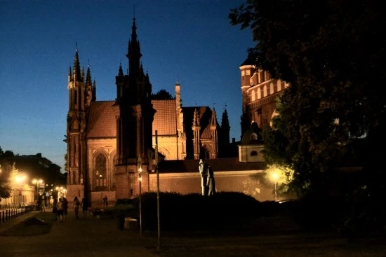 해가 떨어진 이후에 공원쪽에서 간접조명을 받아 빛나고 있는 아담 미츠키에비치동상을 바라보며 또 한장의 사진을 남긴다. 동상 뒤쪽으로 앞에서 말한 두개의 성당이 보이는데, 왼쪽이 성 안나 성당이고, 오른쪽에 나무에 가려 일부만 보이는 것이 프란치스쿠스 베르나르디나스 성당이다.