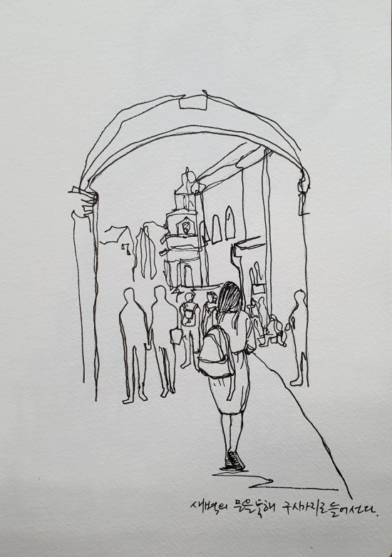 옛날에 구시가지를 찾은 상인이며 여행자들은 바로 이 새벽의 문을 통해 빌뉴스의 구시가지로 들어갔는데, 나 또한 그들의 발길을 좇아 빌뉴스의 구 시가지 안으로 들어가 본다. 이렇게 성 안으로 발길을 내딛을 때면 지구라는 별을 찾은 외계인이라도 된 듯한 설레임 속으로 빠져 듦과 동시에, 과거의 시간 속으로 여행을 하는 낮선 방랑자가 갖게 되는 두려움 또한 마음 한 켠에 또아리를 틀곤 한다.