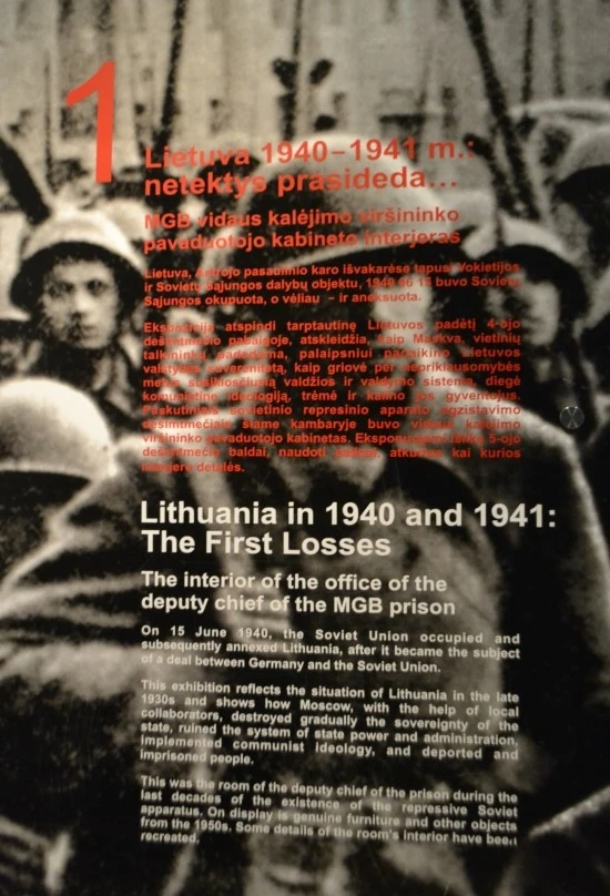 리투아니아 집단학살 박물관은 크게 두 부분으로 이루어져 있다. 그 하나는 각종 자료들로 꾸며진 전시실이고, 다른 하나는과거에 감옥으로 쓰였던 KGB 본부의 지하실(감옥)이다. 전시실은 기본적으로 역사적 사실의 진행순서를 기준으로 배치되어 있는 10개의 방으로 이루어져 있는데, 그 첫번째 방은 소련이 리투아니아를 처음으로 지배했던 1940년부터 1941년까지의 기록이 차지하고 있다.