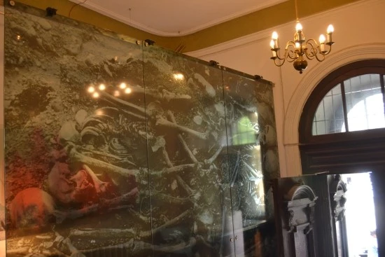 출입구 안으로 들어서면 '리투아니아 집단학살 박물관'의 분위기를 단적으로 보여주는 2장의 사진이 보인다. 그 하나는 흙 위에 뒹굴고 있는 사람들의 뼈가 화면을 가득 메운 사진이고,
