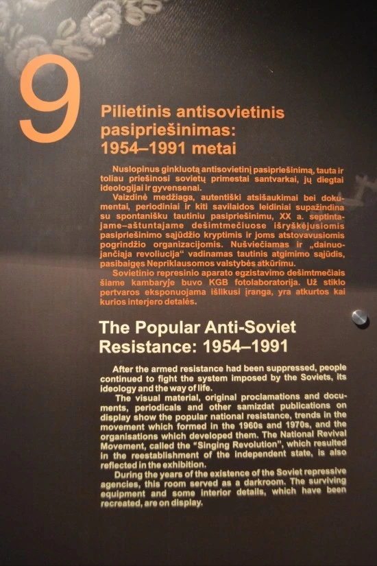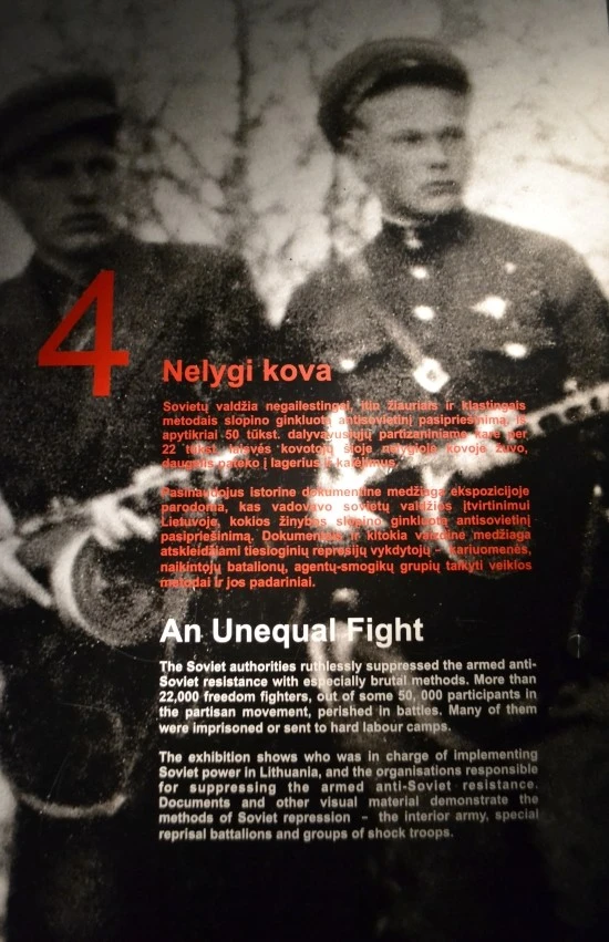 1944년부터 1953년까지의 소련에 대한 리투아니아인들의 항전에 대해 전쟁(War)이라고 표현해 놓고는 있지만, 그 실상을 보면 전쟁이라고 하기에는 양측의 전력차이가 너무도 컸다. 4번 전시실의 이름이 "불평등한 싸움(Unequal Fight)"인 것을 보면 리투아니아인들 스스로 이런 점을 잘 인식하고 있는 것같다.