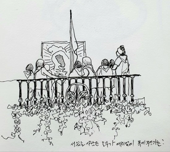 무심코 다락방을 바라보다 특이한 점을 발견했는데, 그것은 다락방에 가득 들어서 있는 사람들이 예외없이 항건을 두르고 있다는 것이었다. 당시에는 다락방의 존재를 모르고 있었기에 다락방을 올라가는 것은 내 여행 계획에 없던 것이었지만, 궁금한 것을 참지 못하는 내 성미가 또 한번 폭발해서 올라가 보았다.