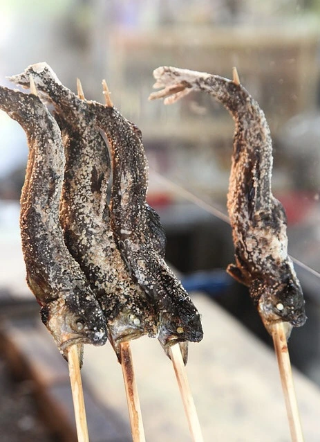 이곳에서 파는 먹거리 가운데 특이한 것은 물고기를 통째로 구워서 나무막대기로 꿰어 놓은 이것인데, 글쎄 비쥬얼은 좀 섬짓하다. 이 물고기는 '곤들매기'라는 어종인데, 일본어로는 '이와나(岩魚)'라고 한다. 이와나는 맑은 물에서만 산다고 하는데, 먹어보지 않아서 그 맛에 대해서는 이야기를 할 수가 없다.