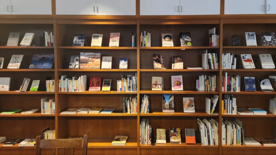 책꽃이를 바라보며 한컷의 사진을 남긴다. 기둥 오른쪽이 내가 앉아 있는 테이블이다.