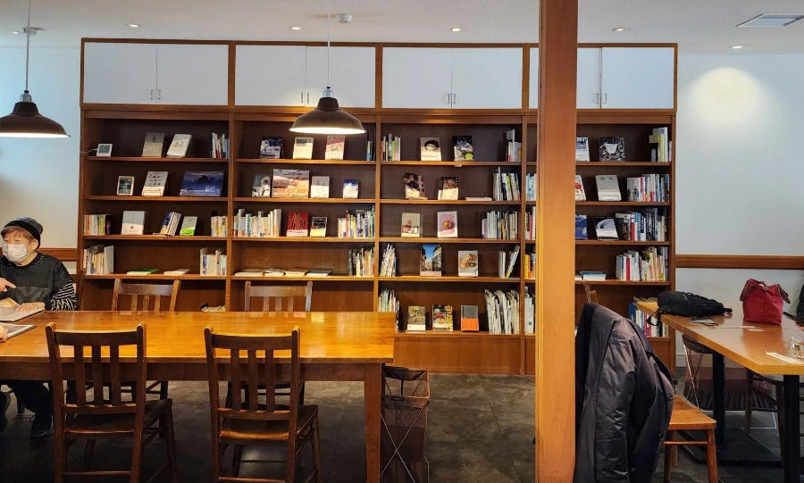책과 음료를 즐길 수 있는 테이블이 있는 공간에서 바라본 매장풍경.