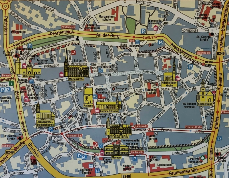 그러니 이곳에 주차시켜 놓고 성안으로 들어가 천천히 걸으며 오랜 역사를 가진 도시 뮐하우젠을 즐기면 된다. 물론 성안에도 주차장이 몇곳이 있기는 하지만, 자리가 있으리라는 보장은 전혀 없다. 더욱이 성안의 대부분의 길들이 보행자전용으로 되어 있어서, 만일에 성안으로 자동차를 가지고 들어갔다가는 자동차가 애물단지로 변해버리기 십상이다. 그러하니 아래 사진 속에 보는 것과 같은 지도 하나 들고, 천천히 걸으며 도시의 풍광을 즐겨 볼 것을 권한다.