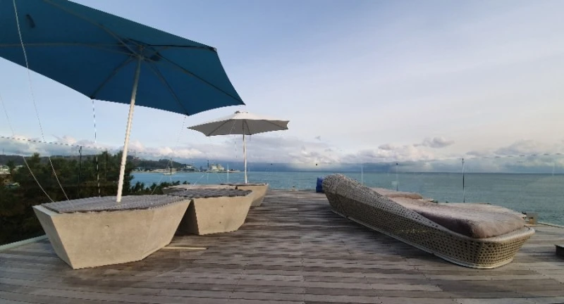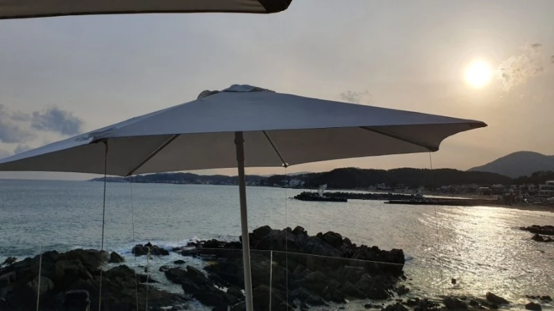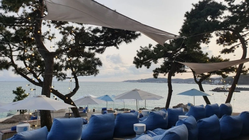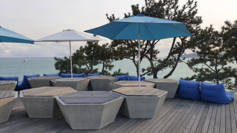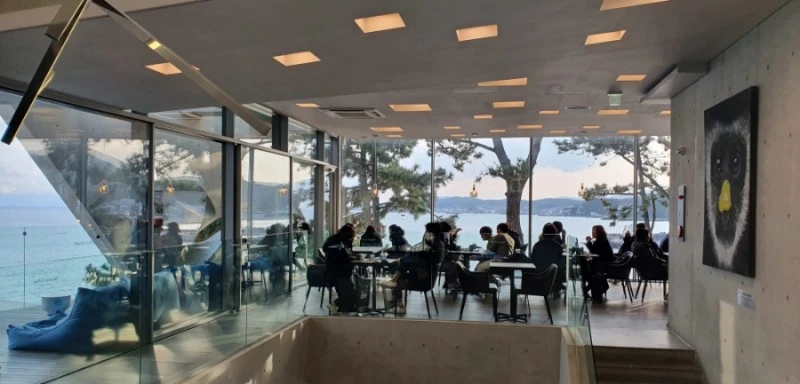1층 외부의 풍광 또한 예술이다. 하얀색에서부터 파란색으로 번져가는 그라데이션을 준 차양과 편한 좌식 의자가 바다와 너무 잘 어울린다. 그리스나 이탈리아의 경치 좋은 바닷가 카페에 앉아 있는 듯한 느낌을 주기에 전혀 부족하지 않다.