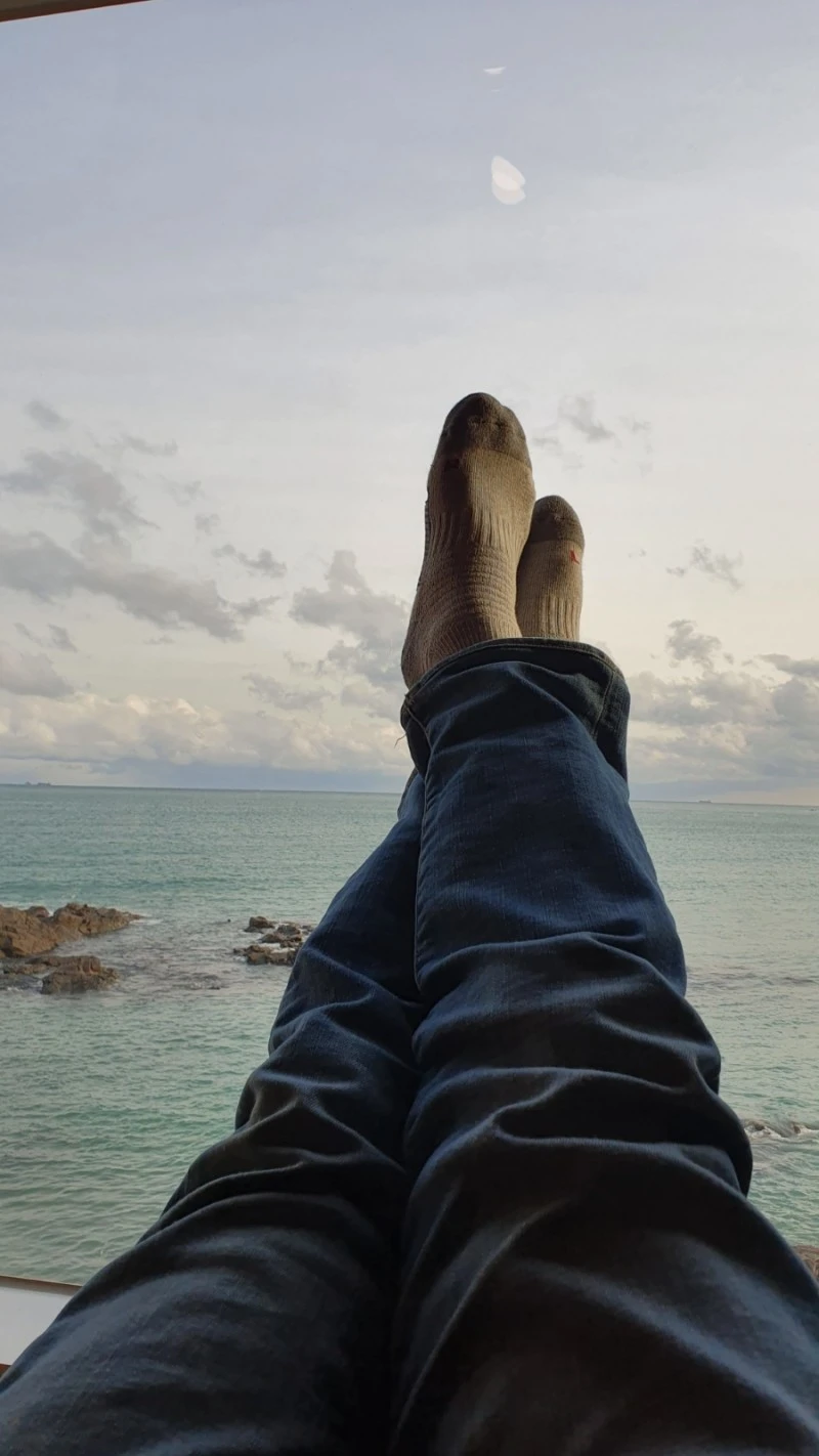 위 사진 속의 의자는 비록 작지만 저래 보여도 흔들의자이다. 때문에 이런 사진을 얻는 것도 얼마든지 가능하다. 흔들의자에 기대어 창문에 발을 뻗고, 바다를 바라볼 수 있다.