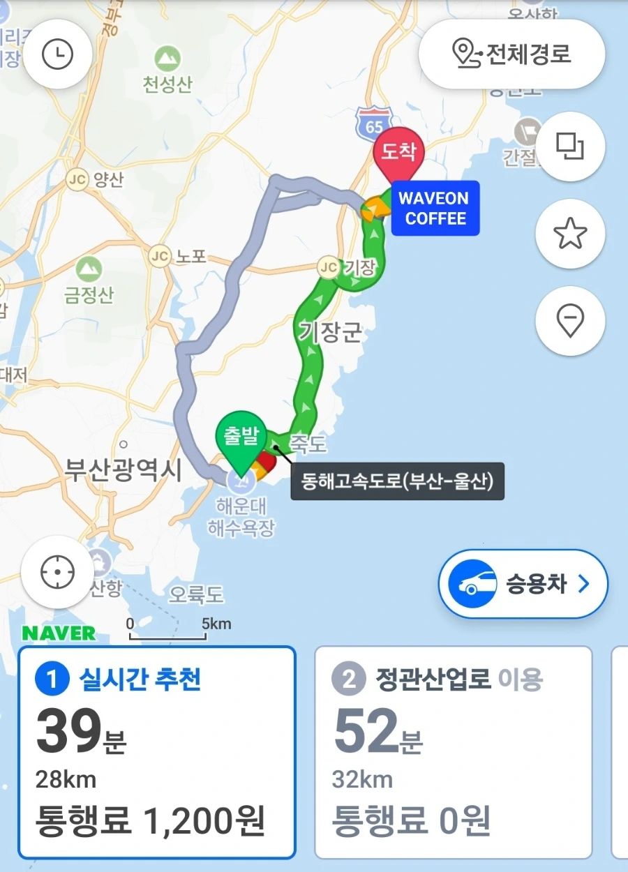 위치? 부산 쪽에서 출발한다면, "WAVEON COFFEE"는 좀 먼 곳에 있다. 아래 지도를 보면 맨 아래쪽에 해운대가 보이는데, "WAVEON COFFEE"는 해운대에서 해안을 끼고 한참을 달려야 하는 곳에 위치해 있다. 내가 직접 차를 몰고 달려본 결과를 갖고 말하면, 해운대에서 천천히 여유 있게 운전했을 때 소요시간은 40분 내외.