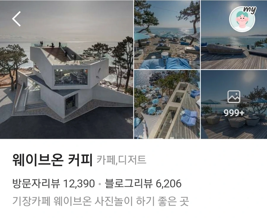네이버는 "WAVEON COFFEE"를 '사진놀이 하기 좋은 곳'이라고 규정짓고 있는데, 이 말도 전혀 틀린 말이 아니다. 카페 건물 자체가 한국 건축문화 대상 본상을 수상했을 뿐만 아니라, 인테리어도 뛰어나고, 그에 더해 아름다운 바다 경치를 품고 있어서 아무 곳이나 대고 셔터를 눌러대도 그대로 그림엽서가 만들어지니 말이다.