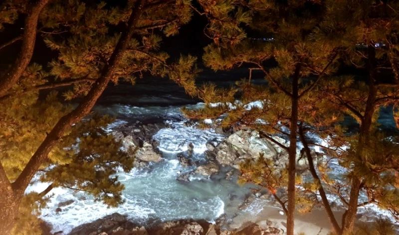 WAVEON COFFEE의 분위기가 마음에 들어 늦은 밤에 또 한 번 이곳에 스며들었는데, 나무 사이로 바라본 바다가 정말 아름다웠다.