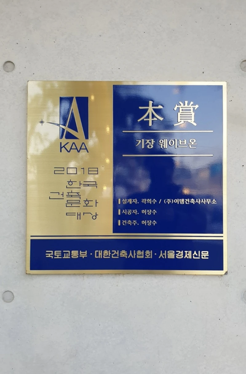 2018년 한국 건축문화 대상 본상을 수상했음을 알리는 동판이 붙어 있다.