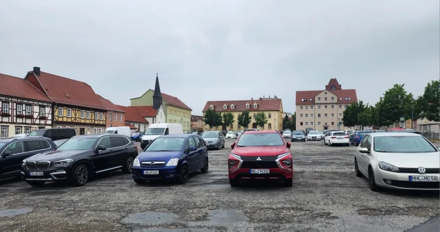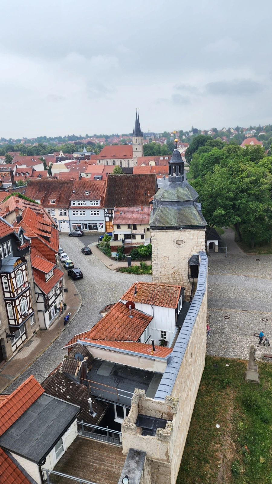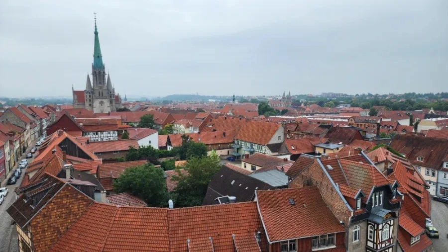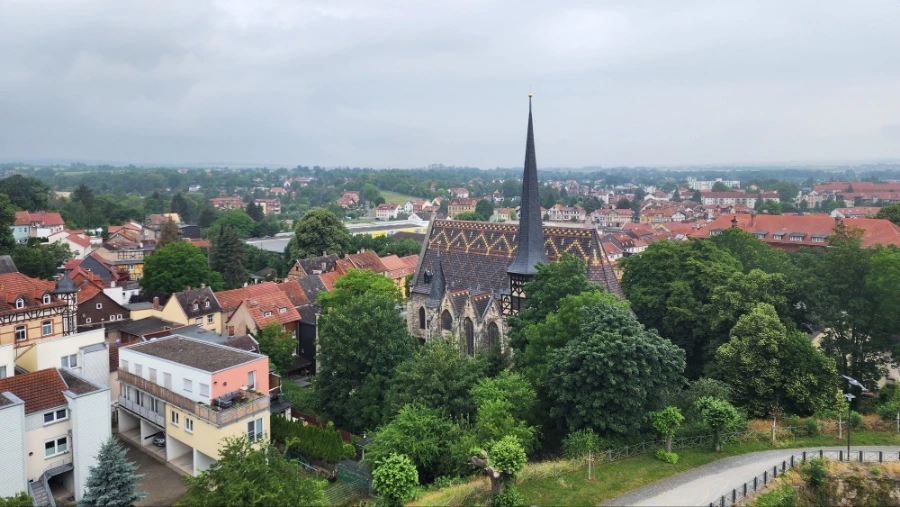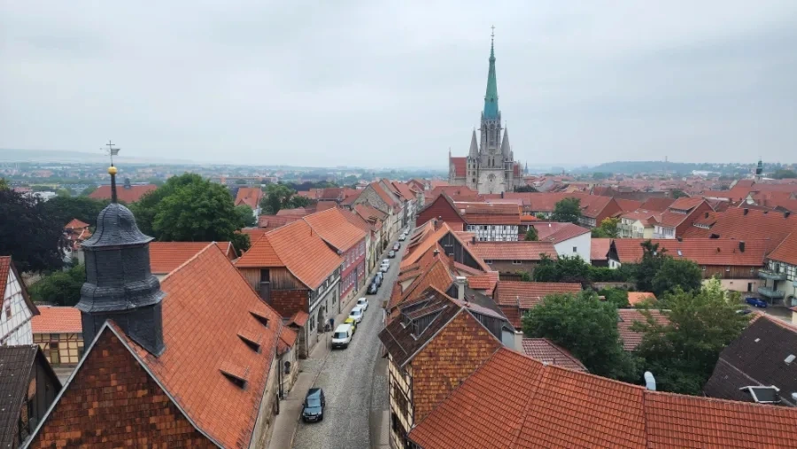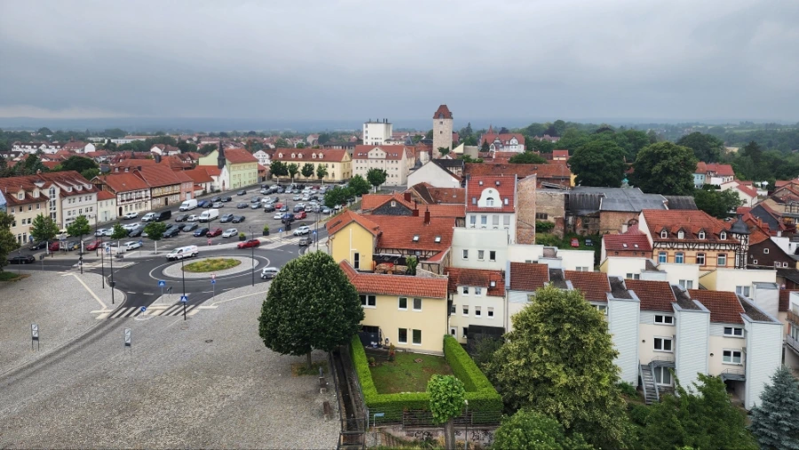 이제 시선을 돌려 성안을 바라보면 이렇게 성안의 풍경이 펼쳐지는데, 뮐하우젠 성안 관광의 랜드마크가 되는 성 마리엔교회(St. Marienkirche)의 첨탑이 눈길을 끈다. 정말이지, 이럴 때면 사진이라는 매체는 실제의 모습을 전하기에는 너무나도 무력하기만 하다는 생각이 든다.