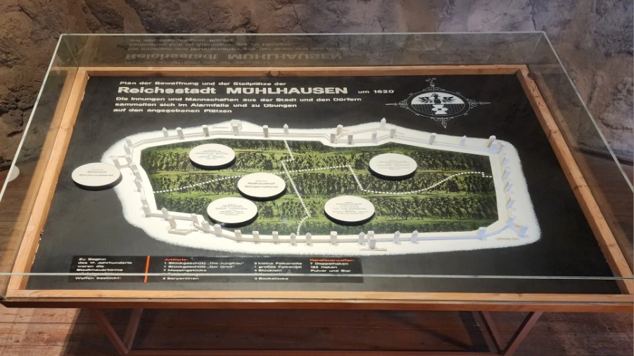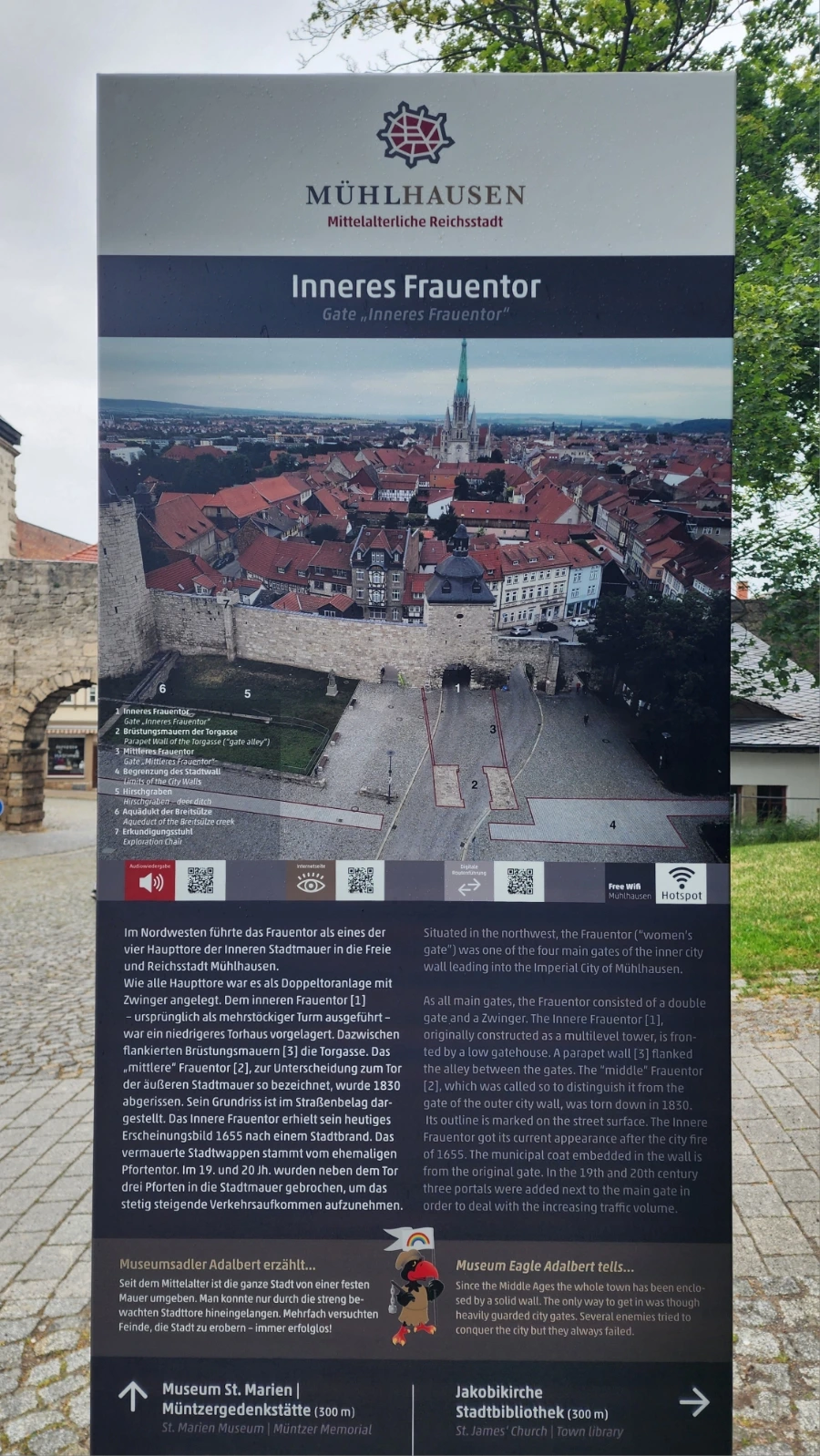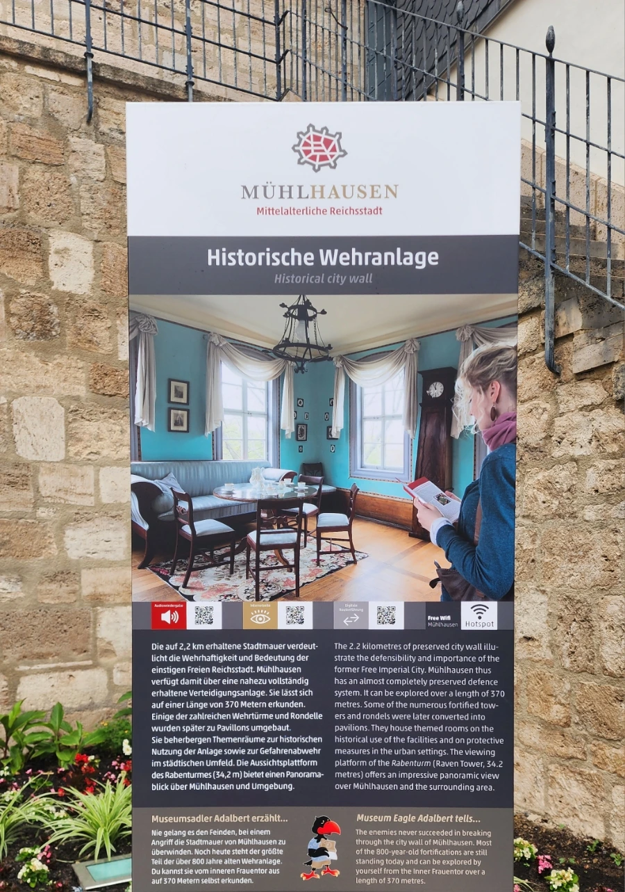 프라우엔토어 오른쪽에 성벽 위로 올라 갈 수 있는 계단이 있는데, 안내판에는 성벽을 '역사적인 방어시설(Wehranlage)'이라고 표현해 놓았다. 또한 안내판은 2.2km에 이르는 성벽은 잘 보존되고 있으며, 뮐하우젠의 방어력과 제국도시로서의 중요성을 잘 보여주고 있다고 이야기 하고 있다.